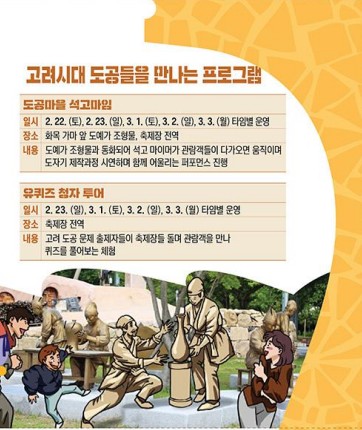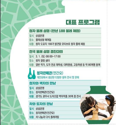 올해 강진청자축제는 겨울의 끝과 시작을 알리는 전남 첫번째 축제로 8개 분야 65개의 풍성한 단위 행사가 진행됩니다. 오직 청자축제에서만 만날 수 있는 다양한 프로그램이 준비되어 있어 남녀노소 누구에게나 인기를 끌 것으로 예상됩니다. 물레 성형 체험을 포함한 청자 관련 프로그램들은 에어돔 내부에서 운영해 쌀쌀한 날씨와 거센 바람에도 체험에 전혀 지장이 없을 것으로 예상되오니 이번 주말 강진으로 떠나보시기 바랍니다.!!!