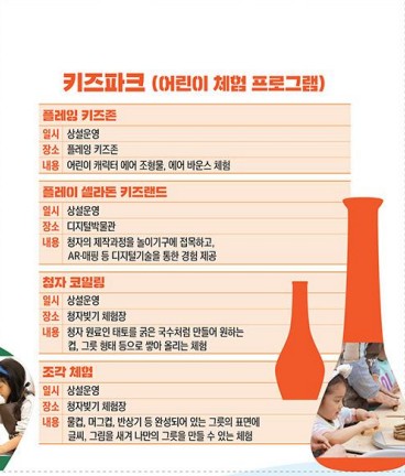어린이와 부모가 함께 즐길 수 있는 청자를 테마로 한 체험 프로그램도 다양하다. 오직 청자축제에서만 경험할 수 있는 ‘청자 물레 성형체험’, 꽃삽으로 흙 속에 묻힌 청자를 찾아보는 ‘청자 발굴 체험' 등 청자 관련 프로그램들을 적극 확대해 다른 축제와 청자축제만의 고유한 차별성을 강조했다.